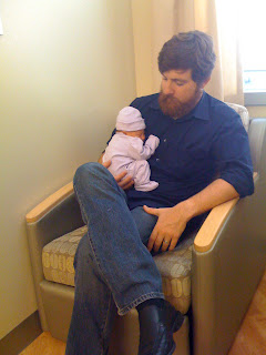 I met my labor and delivery doctor (different from my OB) and she assured me we would follow my birth plan of having a natural childbirth as closely as possible. My water broke just before she started her exam (I think I was 6 cm). She agreed that I didn't have to have an IV if I didn't want one (yay!) and she assured me she would not give me an episiotomy. I also wanted to not cut the cord until it stopped pulsing and she said it would depend since there was meconium in the amniotic fluid. I was given a fetal monitor that allowed me to be out of bed and I labored in a rocking chair in the room for a few hours, with the lights dim and my eyes closed. I tried to rest between contractions as much as possible since it was night time and I wanted to conserve my energy. This was doable until I hit transition and I felt like I was crawling out of my skin. There were two times during this period (I guess it was about 45 minutes) that I thought to myself that getting one of the narcotics to take the edge off might not be a bad idea...but I powered through. Spencer was great prompting me to relax and helping me with my breathing; and holding my hand and giving me water when I needed it. I could not have had a natural childbirth without his support.